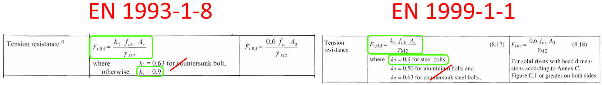 • La seule différence concerne le facteur de résistance à la traction k₂ pour les boulons fraisés et les boulons en aluminium.
