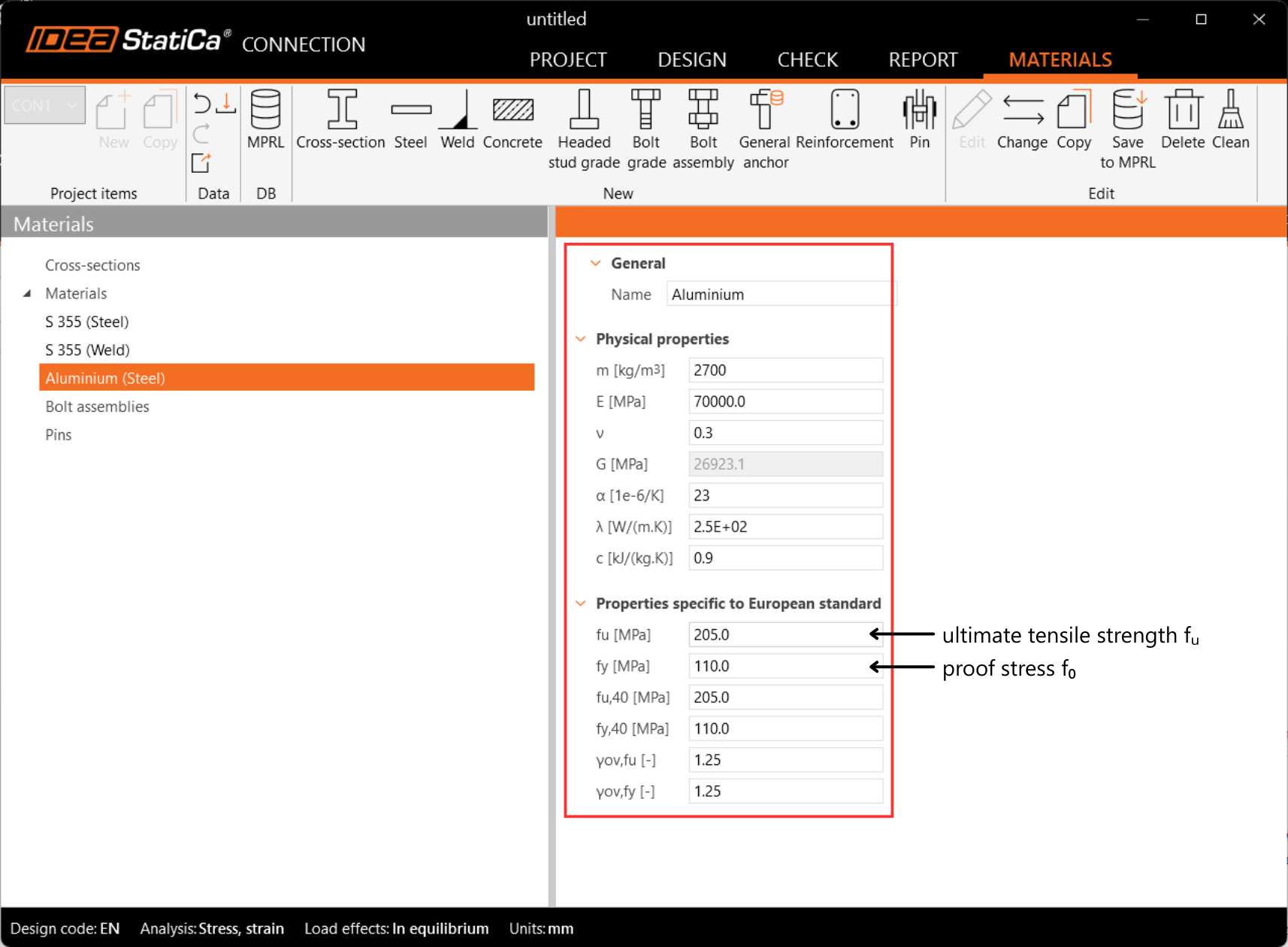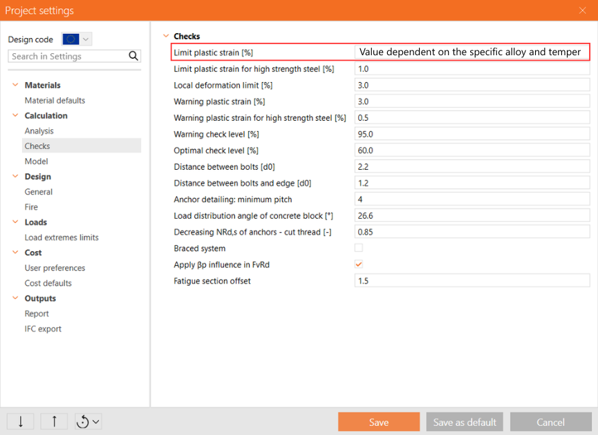 Bien qu'IDEA StatiCa n'ait pas été conçu et vérifié pour le dimensionnement des structures en aluminium et de leurs assemblages conformément à l'EN 1999, il peut être utilisé avec précaution pour l'aluminium, qui est un matériau métallique ductile, similaire à l'acier.
