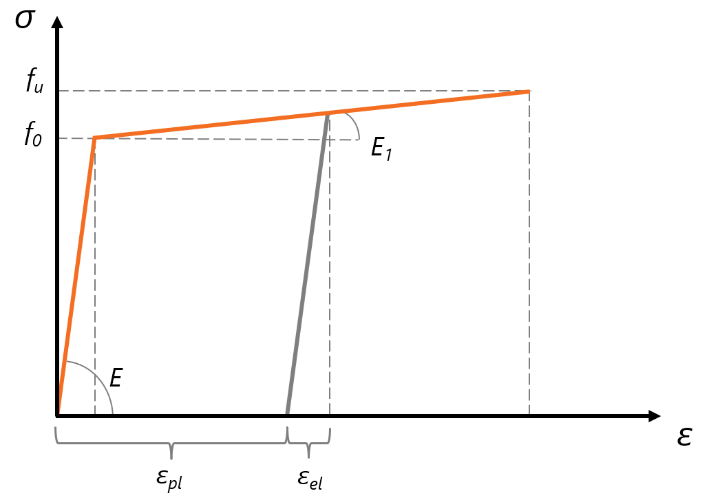 Pour l'aluminium, le module d'écrouissage E₁ n'est pas constant et doit être déterminé à partir de fᵤ, f₀, εu, εp. Cela diffère de l'acier, mais IDEA StatiCa utilise la relation fixe E₁ = E / 1000 et ne peut pas être modifiée.