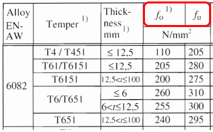 La limite d'élasticité conventionnelle (équivalente à la limite d'élasticité de l'acier) et la résistance à la traction varient selon chaque alliage et état métallurgique. Ces valeurs doivent être extraites de l'EN 1999‑1‑1 et saisies manuellement lors de la définition d'un matériau utilisateur.