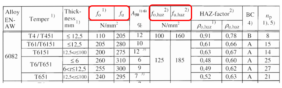 Les propriétés du matériau doivent ensuite être ajustées en fonction des spécificités de l'aluminium.Si l'assemblage comprend des soudures, les valeurs ZAT  f0,haz et fu,haz doivent être prises en compte.