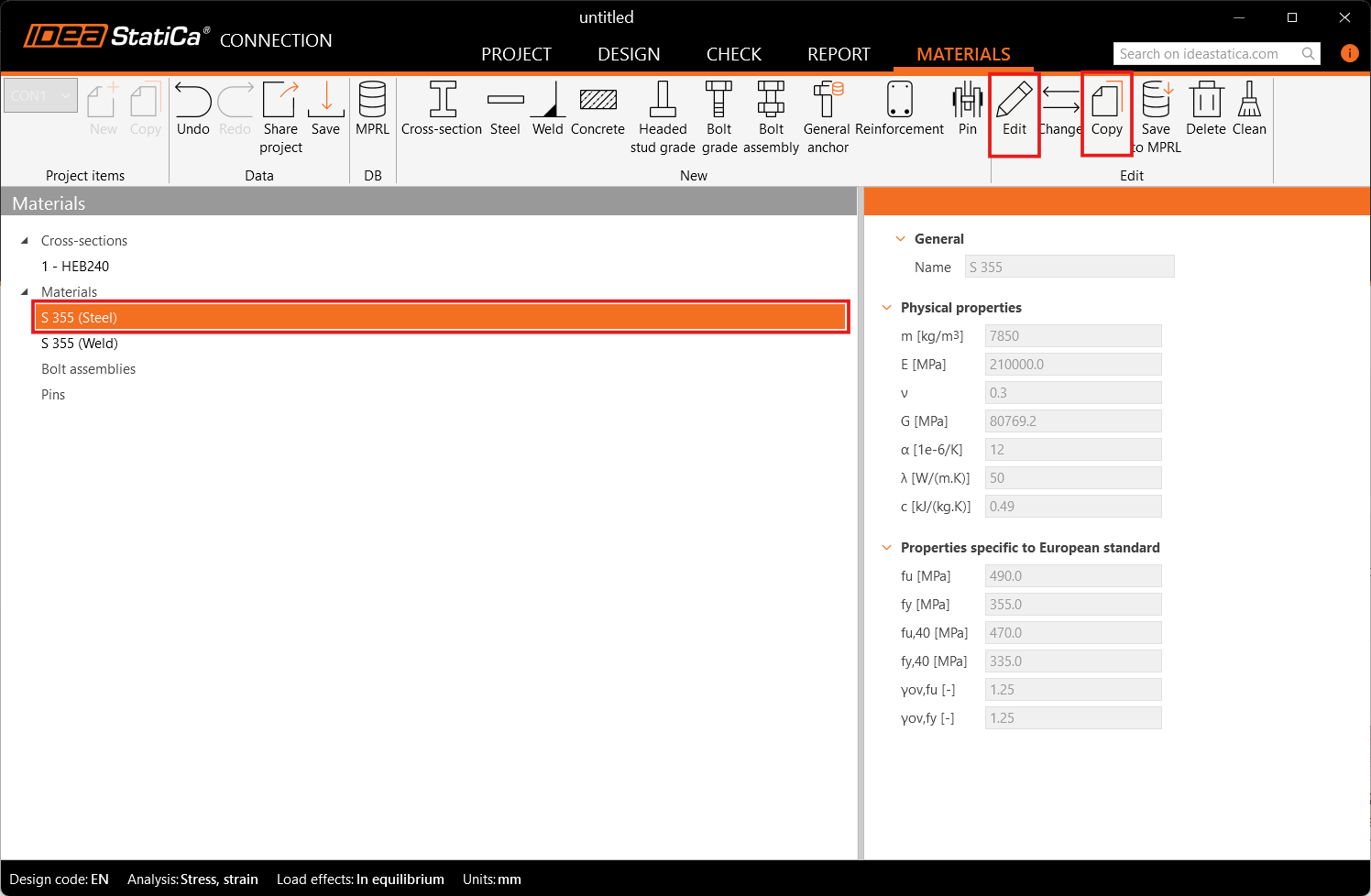 Les matériaux définis par l'utilisateur peuvent être enregistrés dans la bibliothèque MPRL, où ils sont disponibles pour une utilisation dans tous les projets futurs dans IDEA StatiCa Connection.