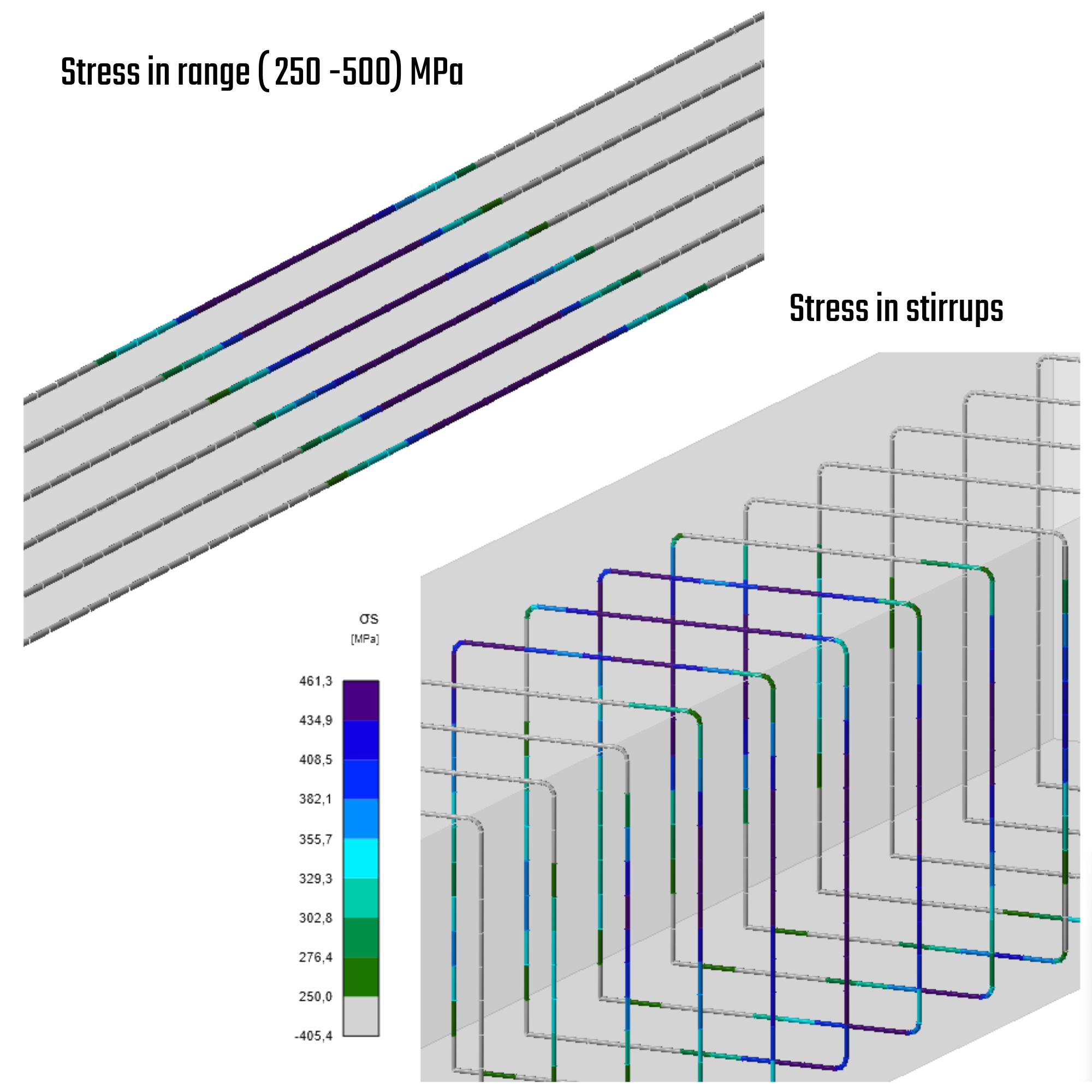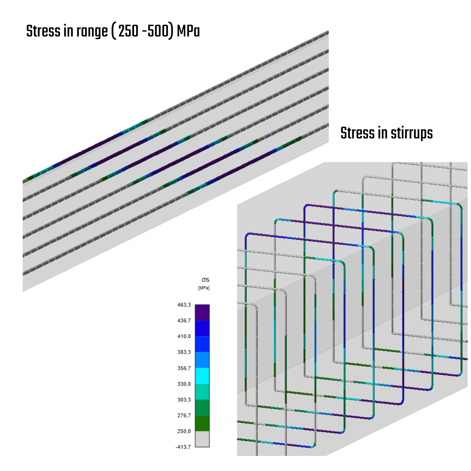The maximum shear stress on the closed stirrups has reached a value of 460 MPa, which means that shear failure must also be taken into account.