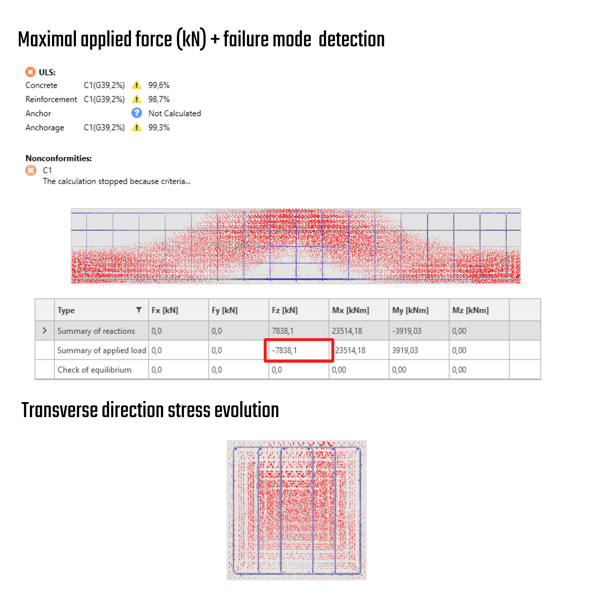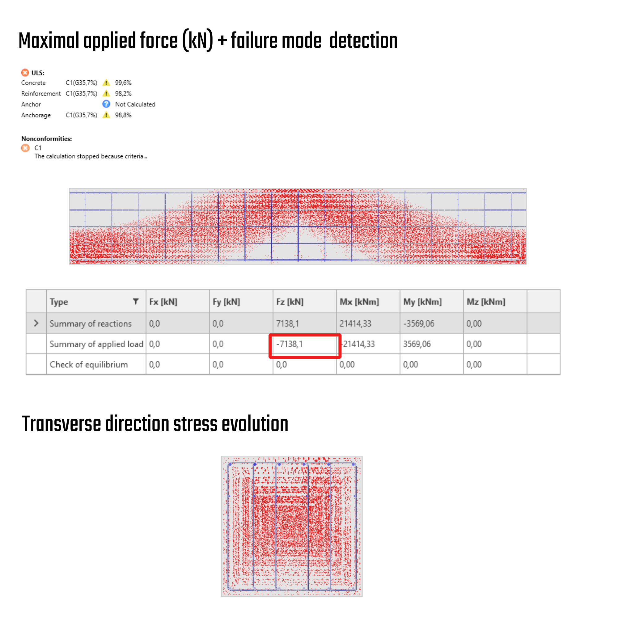 The force absorbed by the footing strip reached -7838 kN, which is approximately the same as bearing capacity in LSS. The failure mode involves concrete crushing, tensile rupture of the longitudinal reinforcement, and the horizontal legs of the stirrups in tension.