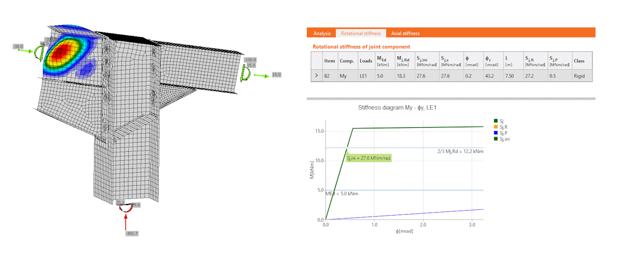 For moment frames, it is essential to verify that the connection provides sufficient rotational stiffness to meet the assumptions of the global analysis model. The stiffness of a haunched joint depends on the beam, column, haunch geometry, and detailing. In IDEA StatiCa, the rotational stiffness can be evaluated directly, allowing engineers to confirm joint classification and ensure compatibility with the structural analysis assumptions.
